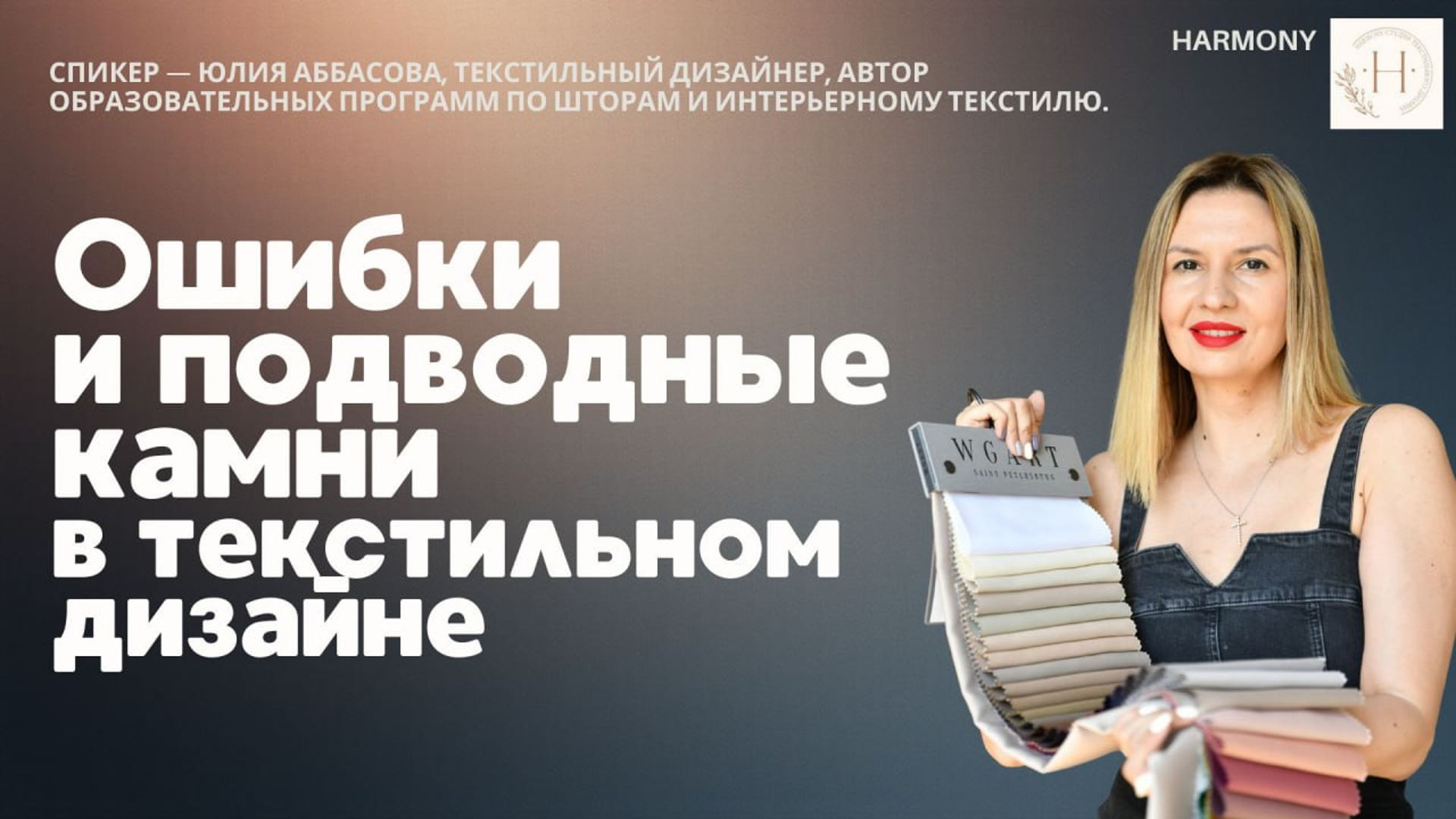 Как решить проблемы с выбором текстиля для проектов, разобраться в особенностях работы с разными тканями, избежать дорогостоящих ошибок в работе, быть в курсе актуальных трендов текстильного дизайна — расскажет основатель студии текстильного дизайна Harmony, эксперт с 18-летним опытом в маркетинге Юлия Аббасова на семинаре в Современной школе дизайна.